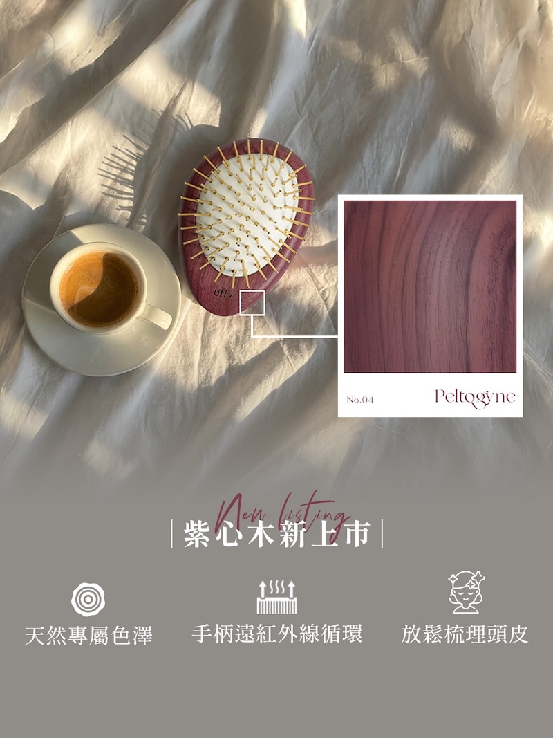 ✸ 紫心木實木梳身|天然木紋,使用後專屬深淺變化