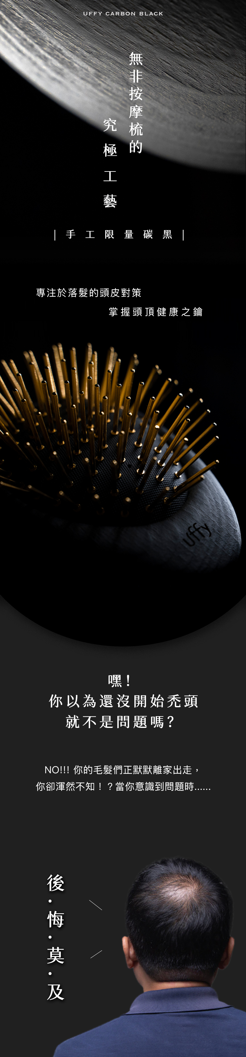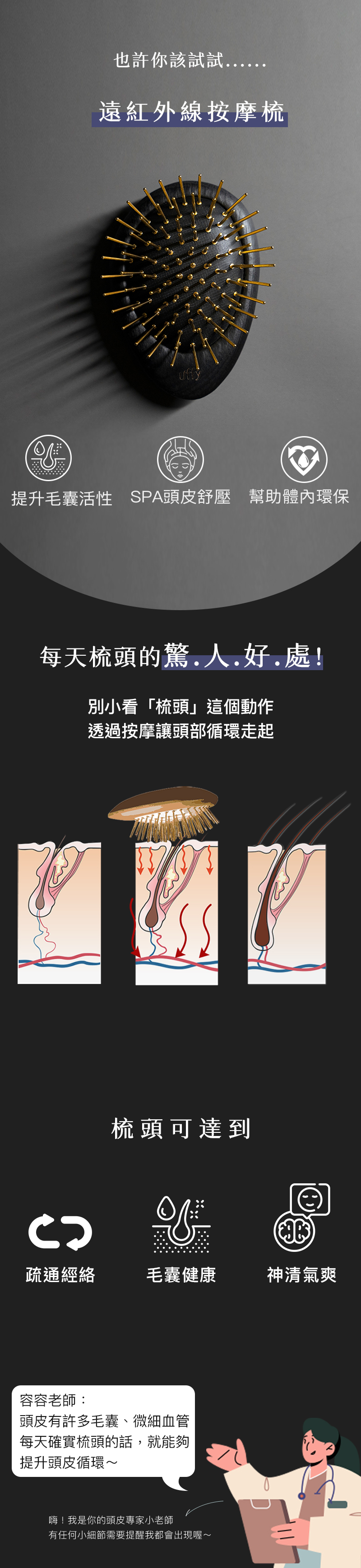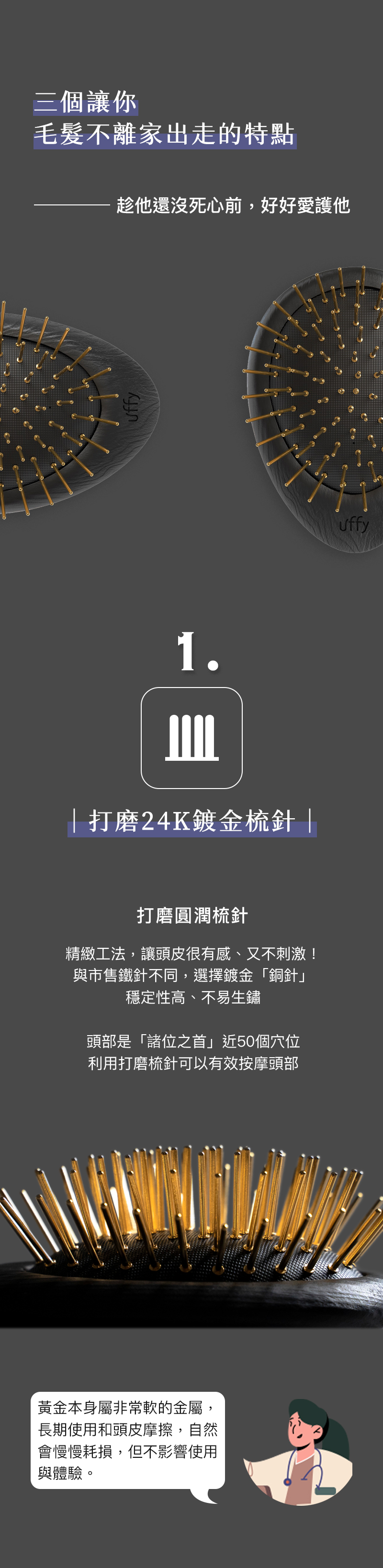 ✸ 24K鍍金銅針(黃金梳)|減少靜電困擾,輕柔貼合頭皮
